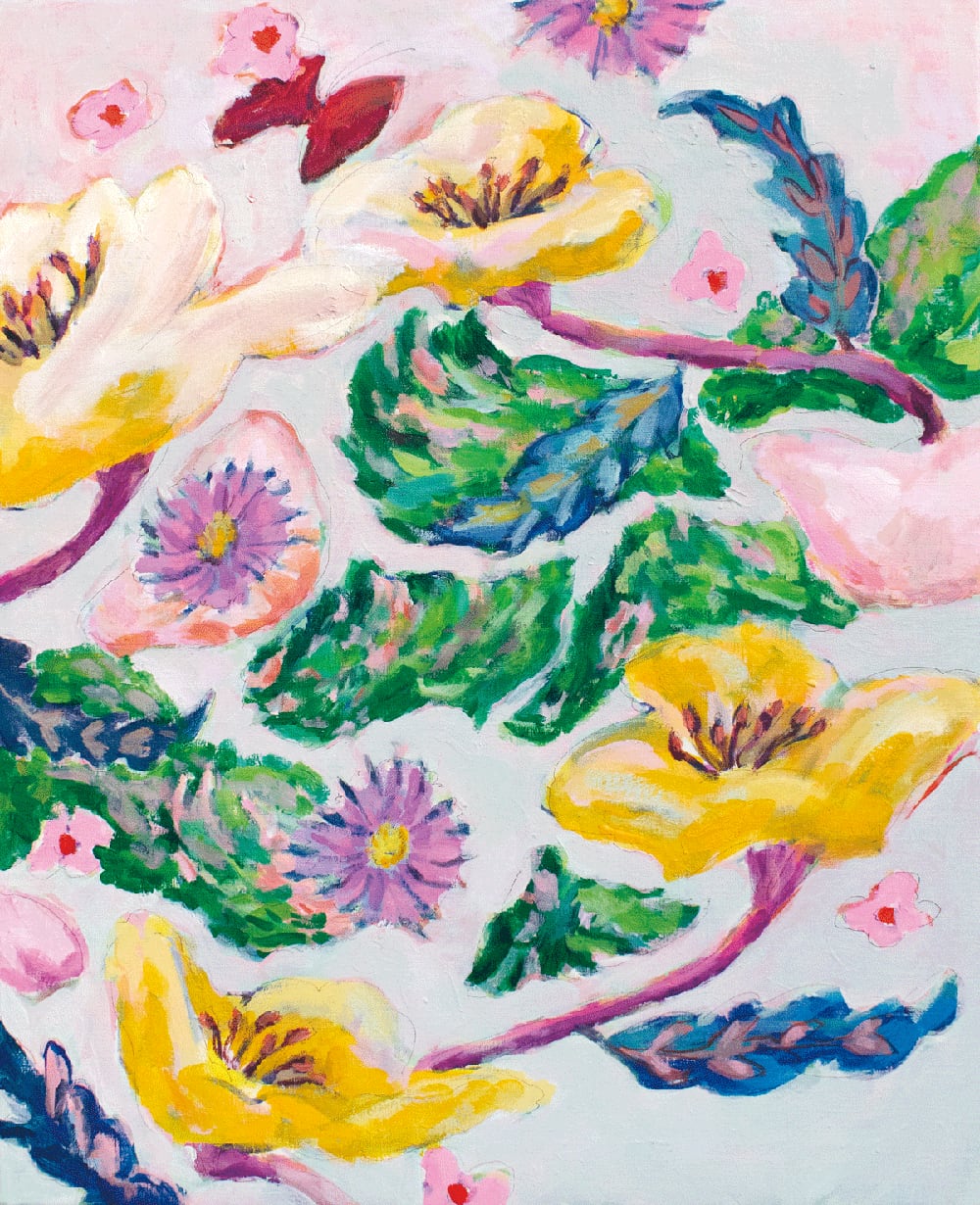 「もし花が女の子になったら」をテーマに描いたFlower girlシリーズを展示した2026年1月の個展『Into bloom』の作品の中の一点です。